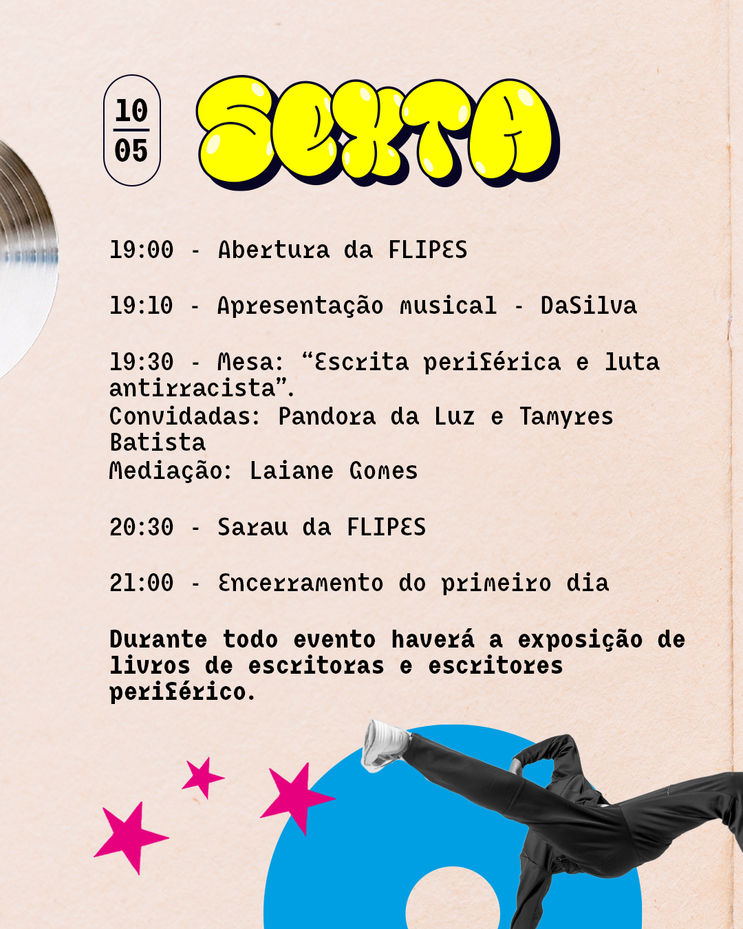A Feira Literária Periférica do Espírito Santo (FLIPES) é um evento cultural voltado à valorização da produção artística das periferias capixabas. Realizada no MUCANE — Museu Capixaba do Negro —, a iniciativa reúne literatura, música e diversas expressões artísticas, promovendo visibilidade para autores, coletivos e agentes culturais historicamente sub-representados no circuito tradicional.